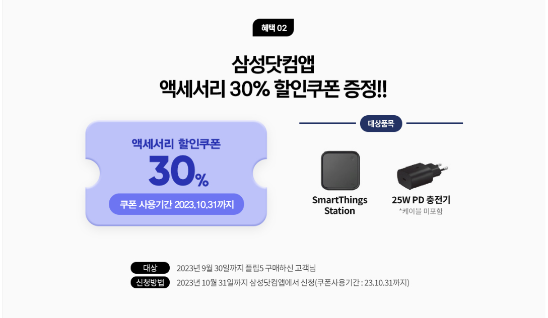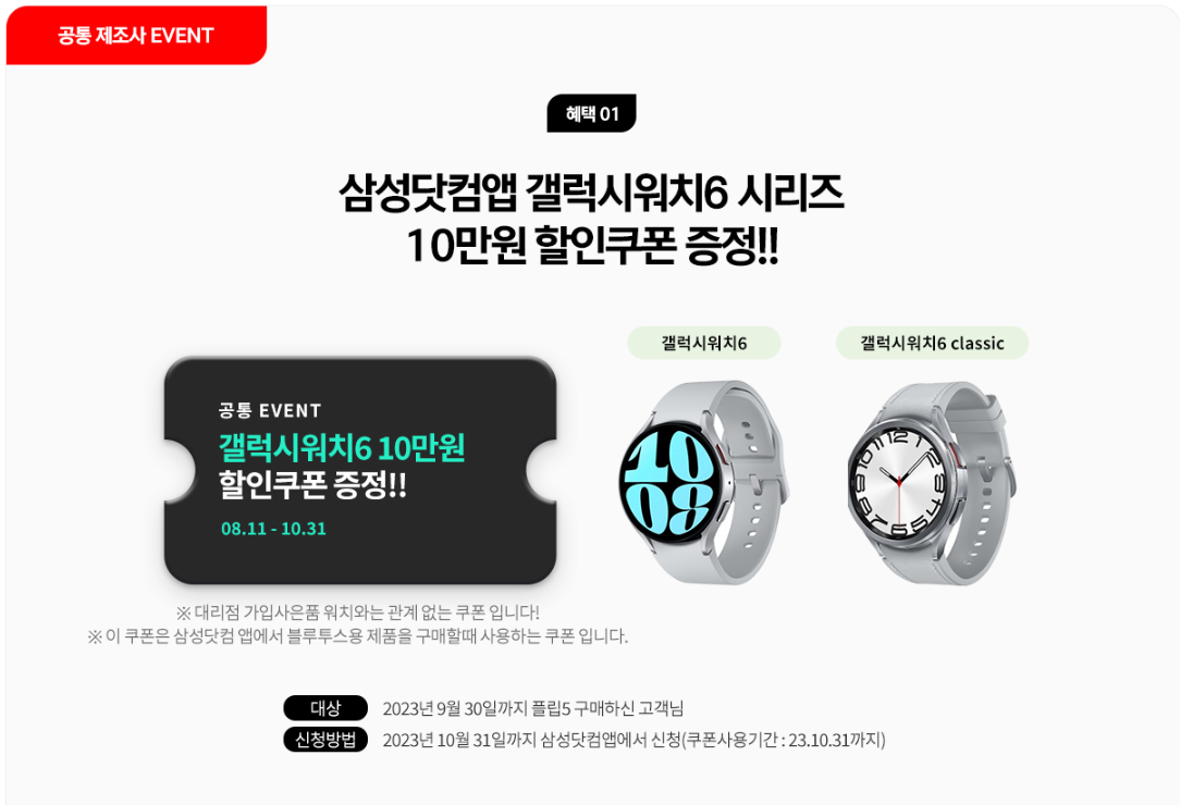 우선 삼성에서 제공되는 사은품은 삼성닷컴 앱 갤럭시 와치 6 시리즈 10만 원 할인 쿠폰과 삼성닷컴 앱 30% 할인 쿠폰, 정품 보호필름 1회 한정 무료 부착 서비스 쿠폰, 유튜브 프리미엄 4개월 무료 체험권, 마이크로소프트 365 베이직 6개월 체험권, 윌라 3개월 무료 구독권 등이 있으며 512G로 무료 업그레이드 제공이 있습니다.